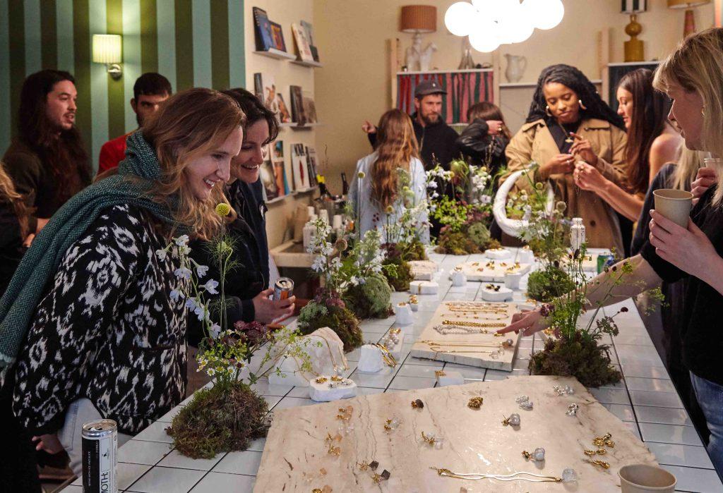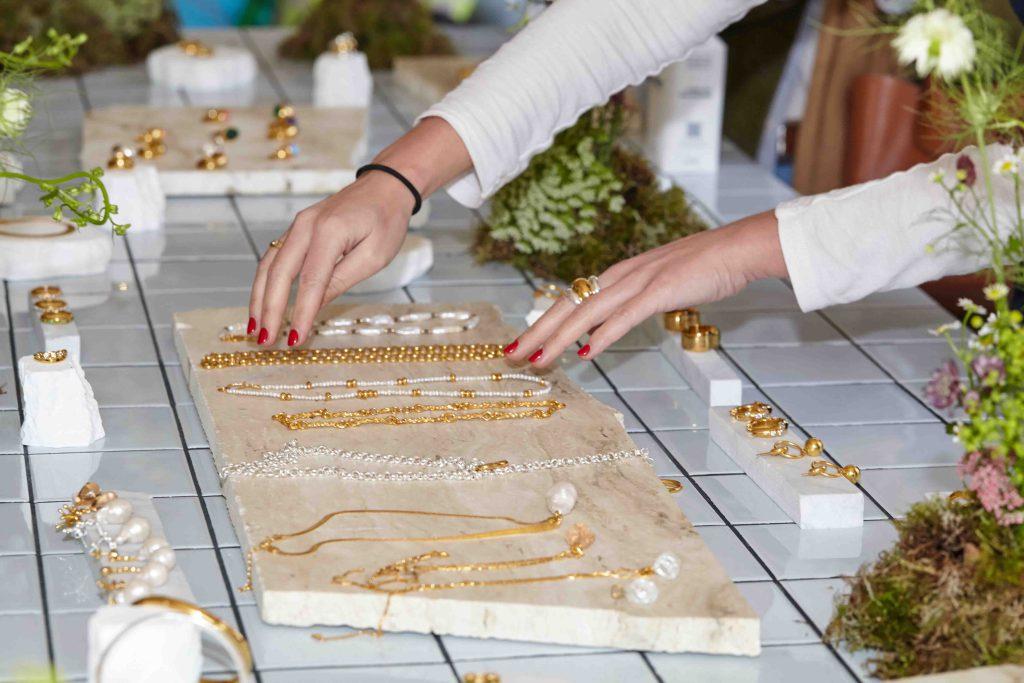 Colours of Arley in Shoreditch. The pieces are organic in silhouette and incorporate natural elements and semi precious stones. Alice wanted delicate spring flowers set amongst the stone display slices. We created mini moss based mounds with sprouting stems to enhance the scene.