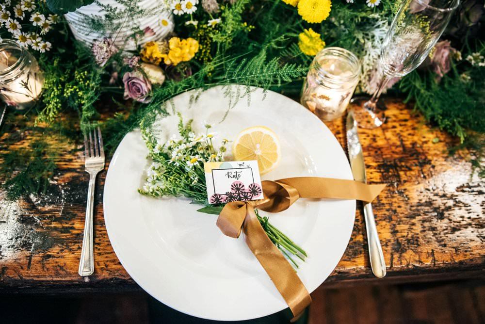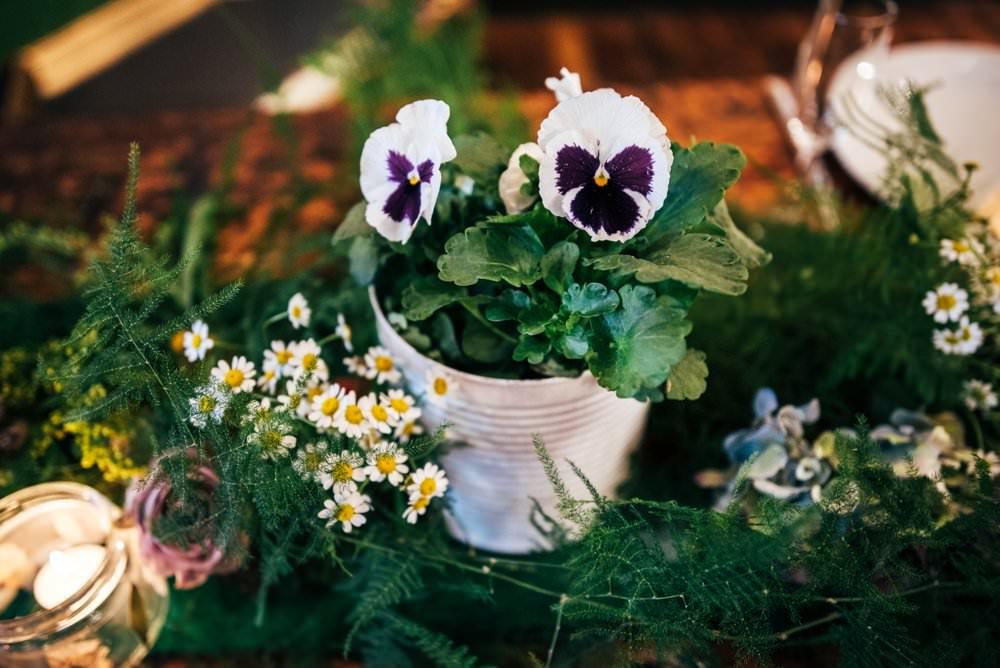 Set in one of the most authentic London pubs, our mission was to create a colourful and seasonal tablescape, working alongside the chef’s menu. Potted pansies in white tins, delicate asparagus fern flowed through the table, with delicate daisies and pressed flower tea light holders.