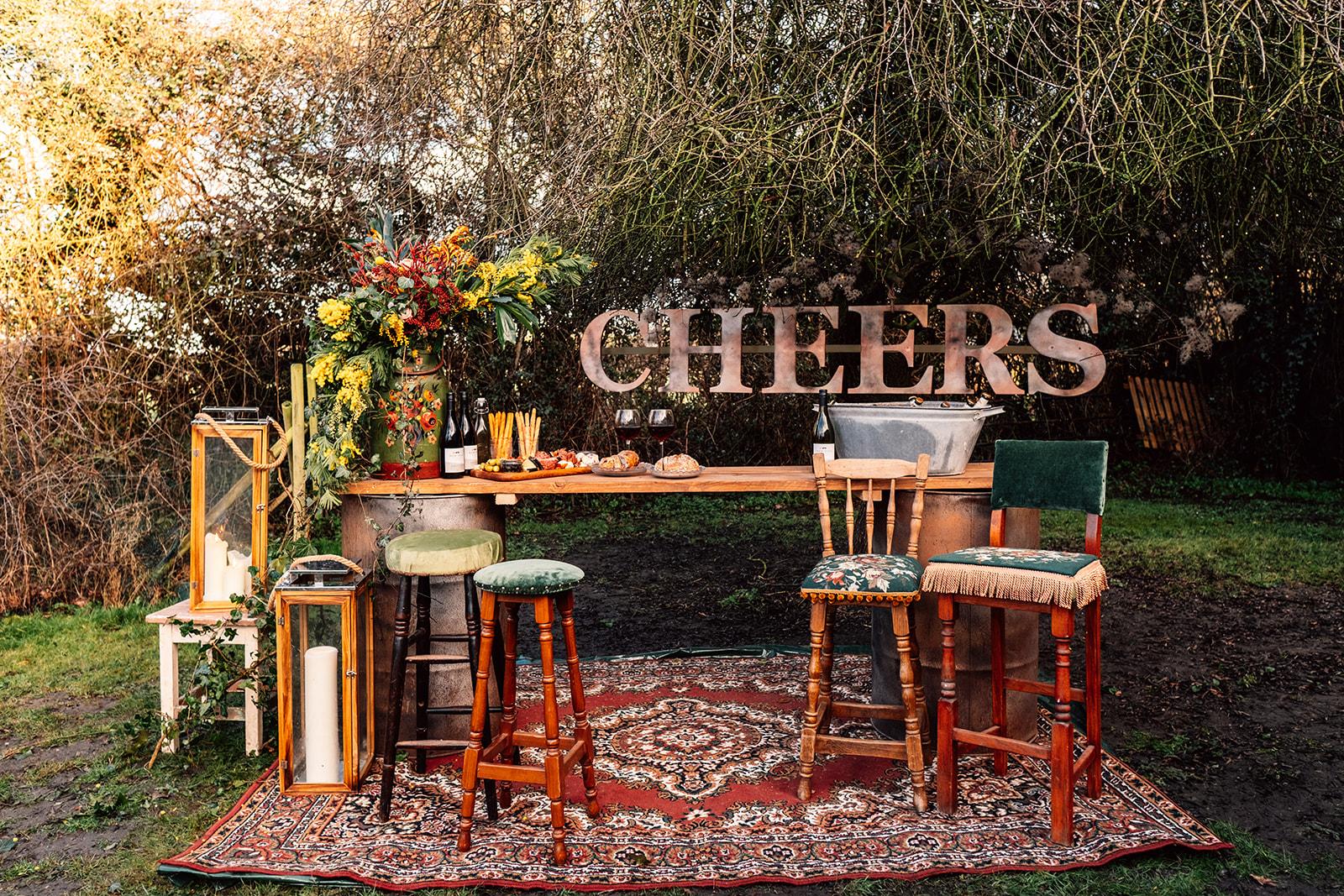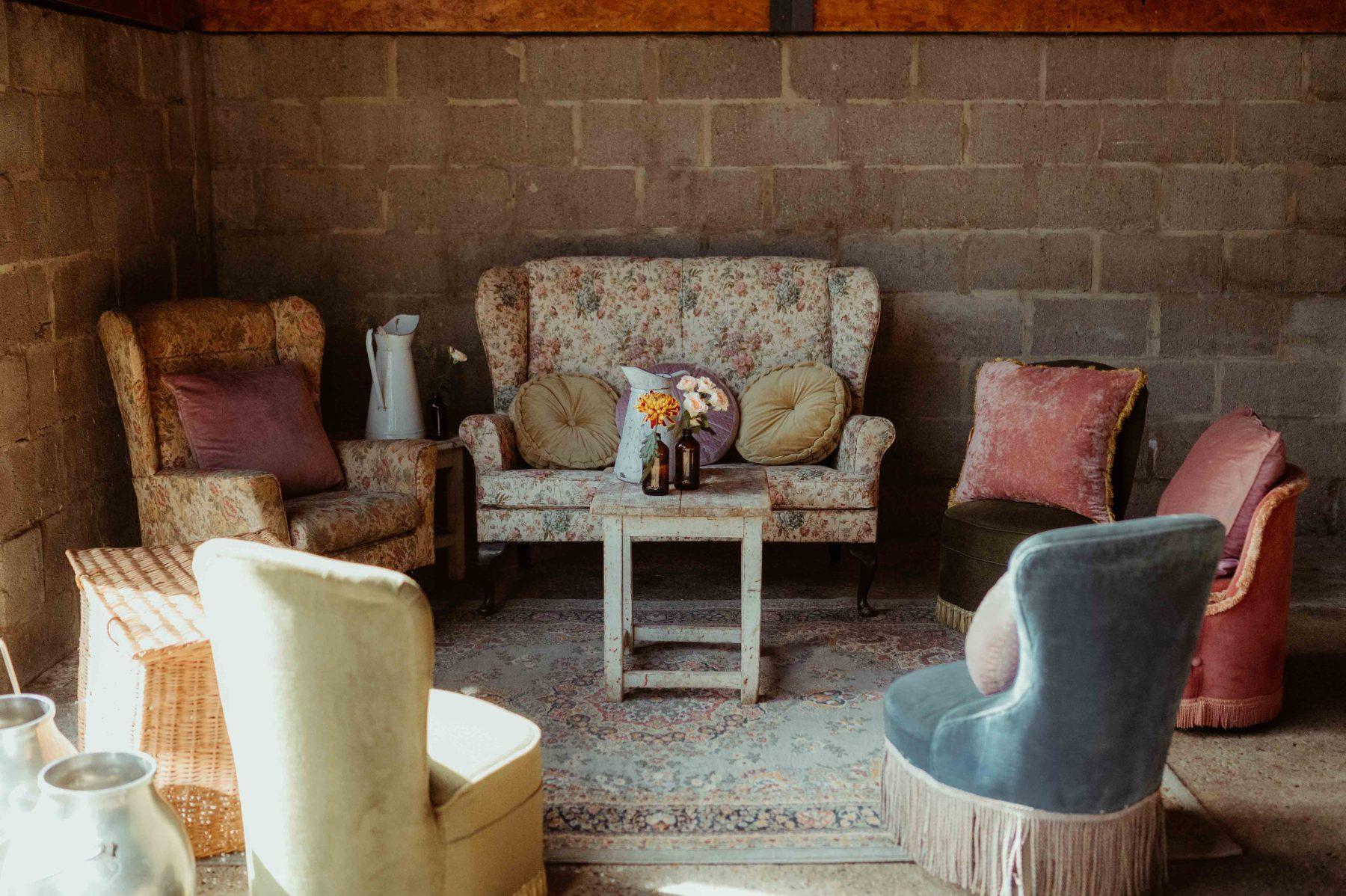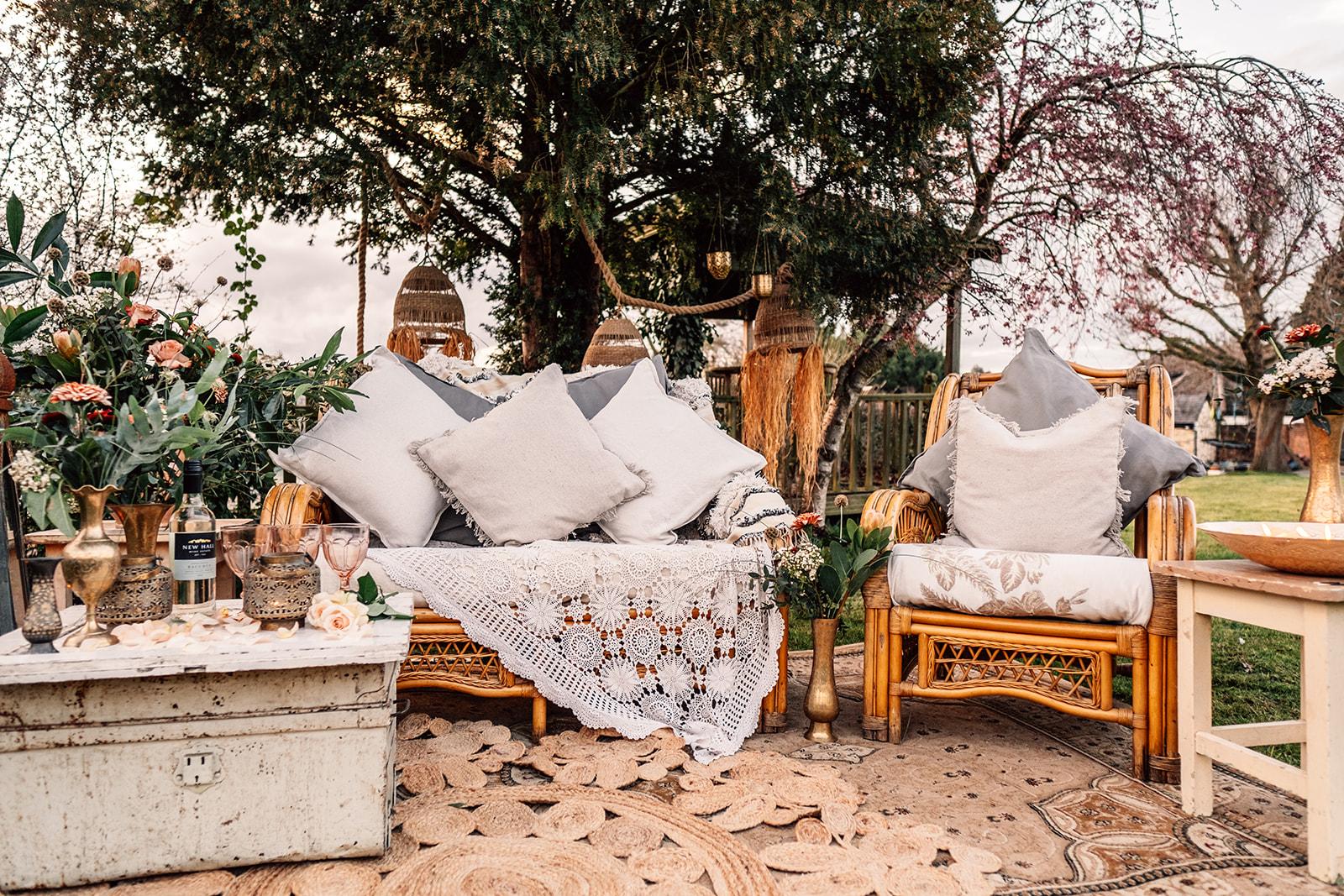 Mismatched rugs, crates, tables, cosy lounge set-up with velvet cushions, bike bar, bar stools, cocktail lounge, vessels for flowers, candlesticks, vintage crystal, vintage china, fabric runners, festoon lights in warm white & circus combo, warm white fairy lights, connectable fairy light curtains, vintage patina or silver trays, worn gold table runners, Ukrainian aisle runner, picnic basket or distressed white metal trunk for gifts, various sized gilt frames & easels and much more!